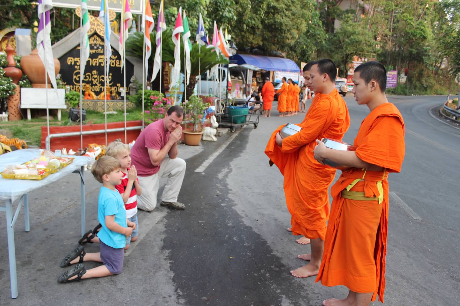 We loved giving food to the monks. I never realized how fascinating the monks are. First of all, it is not a “role” for life. You can be a monk for 2 weeks or 2 months – you just need to follow their simple life, purify your mind and teach buddhism. We got to a novice temple where many young boys go to become monks from all over Thailand. Since they rely on people for food and breakfast is their largest meal (small lunch and no dinner), every early morning people bring food to them and get a blessing in return. So, we all brought food, asked a monk to approach us, put food into their large pots and then kneeled down to receive a blessing in return (in Bali language). The boys were barefoot, with shaved hair and large orange outfits wrapped around them. Of course, Maxie was more interested in the food itself since we skipped the fantastic breakfast in the hotel (his favorite part of the day) – and this was after the initial disappointment of what he thought was going to be feeding of chipmunks.