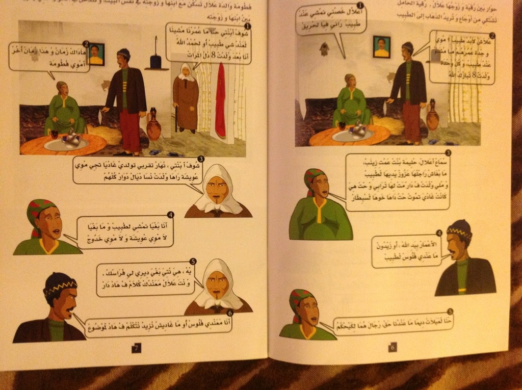 The book below is a handout that I picked up that explains what should be unacceptable behavior and the women should stand up to. The story goes like this and reads from right to left – the woman is pregnant, having contractions, asks the husband to see a doctor. He responds that his other wife or she already had 8 kids and doesn’t need a doctor. She says that her friend had a baby that almost died and she herself needed medical care. His response – “death is between you and Allah, no doctor”.