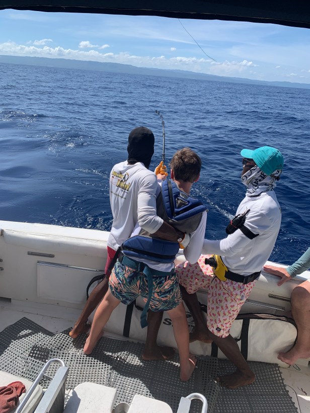 • Boat – not huge, way smaller than our other trips and it is 7 of us – small inside with benches to sit on and covered and then back to sit and watch the fishing rods and the waves from engine – on a pretty hot sun. Professional gear to fish though.