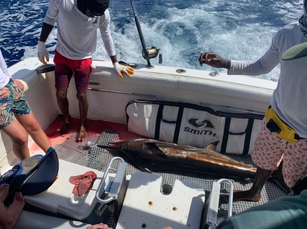 • Finally, fish is coming onboard with some harpoon looking hook – but before it does – the Jamaicans take a huge bat or hammer and literally start hitting it with it – holy god – my face looked like the mask from Scream – what are they doing and why are they killing it – wouldn’t it die once we got it on the boat? I guess they didn’t want to risk getting poked because it had a huge spear. It was a marlin, not a swordfish and was apparently close to 200 lbs. I can tell b/c everyone who pulled him out has shaky arms, sweats and fingers are hurting.