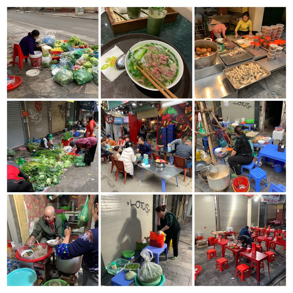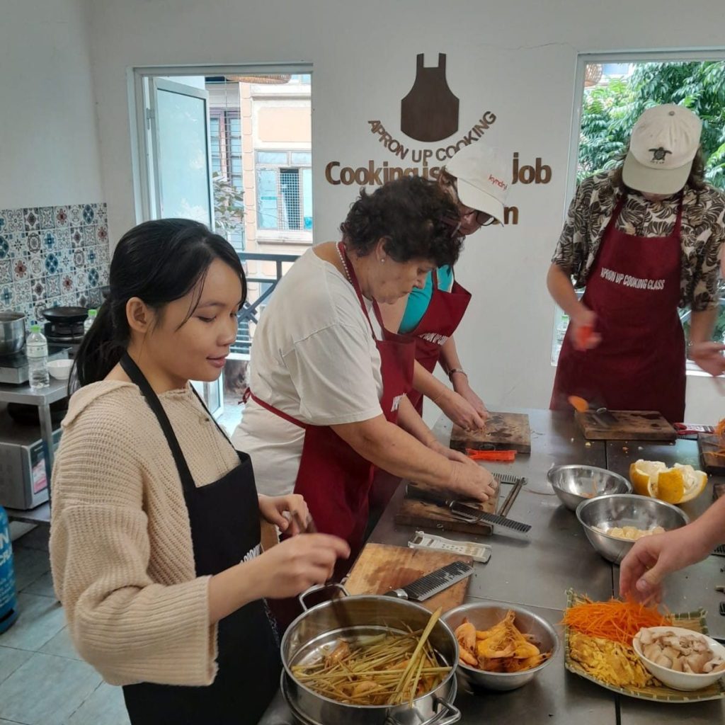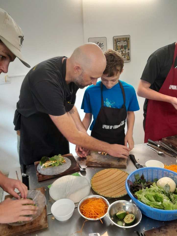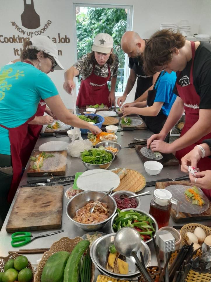 9 am on Day 2 comes and we are knocking on Apron cooking school door. We pre-picked 5 meals from the menu ahead and were ready for a 4 hour adventure. Our menu was pho bo (Vietnamese soup with beef), pomelo salad with shrimp, fresh shrimp rolls, lemongrass chicken, steamed banana cake and egg coffee. Starving we were not going to be. .