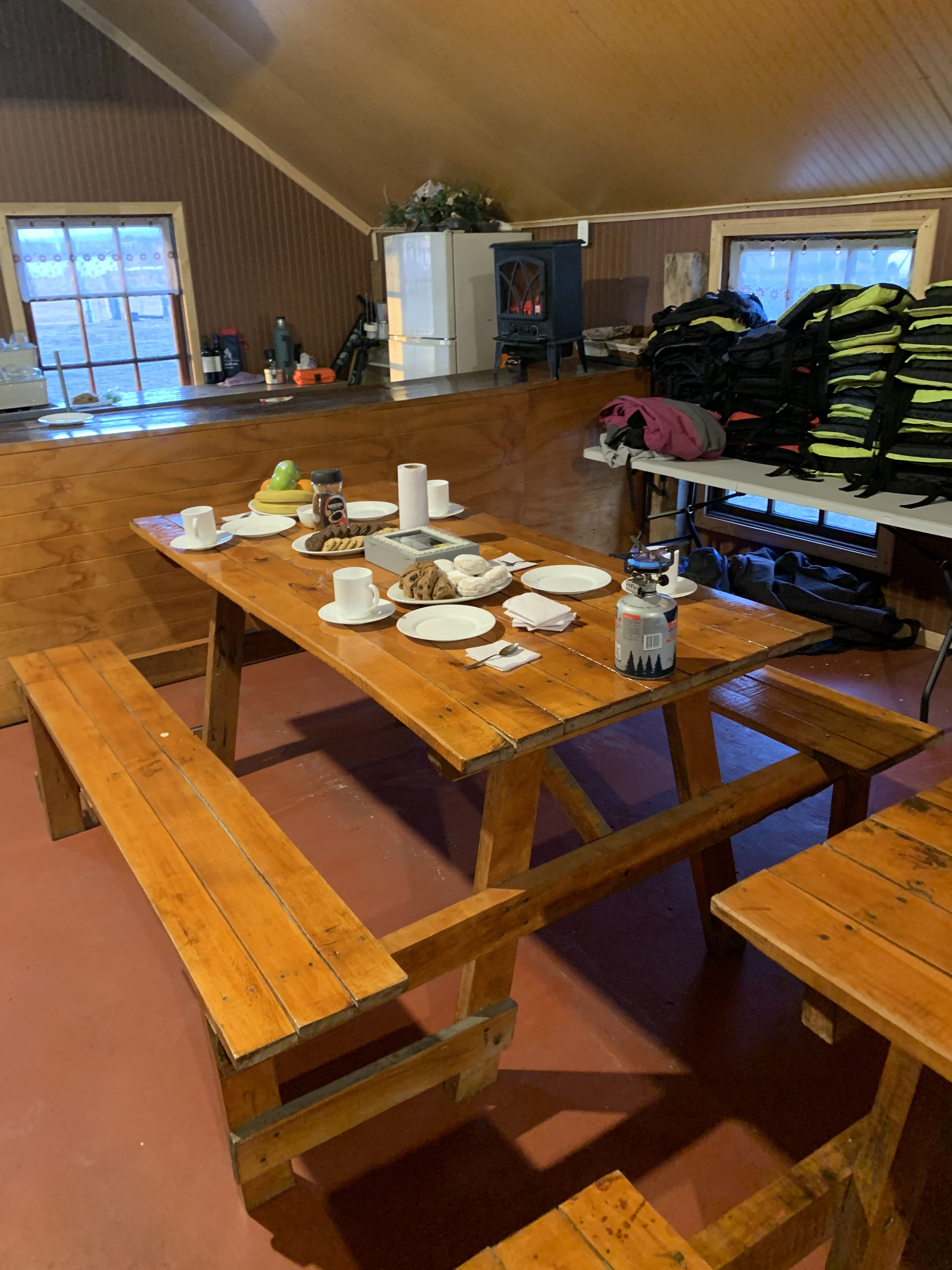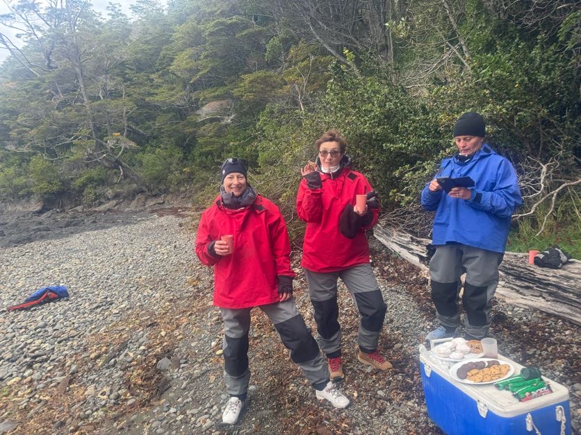 We drove to a farm with llamas, guanacos, sheep and horses by the water and some of the guides disappeared while Crisellen, the main guide, handed us rubber pants with suspenders, jackets, gloves, hats – we looked unrecognizable and walked like bears with all of our own clothing already pretty heavy – this was getting interesting. The, to our surprise, an amazing breakfast was served – I mean literally at 6 am – again – nowhere, at literal and figurative end of the world – they whipped up warm breakfast in the barn AND coffee. They baked fresh bread and eggs!